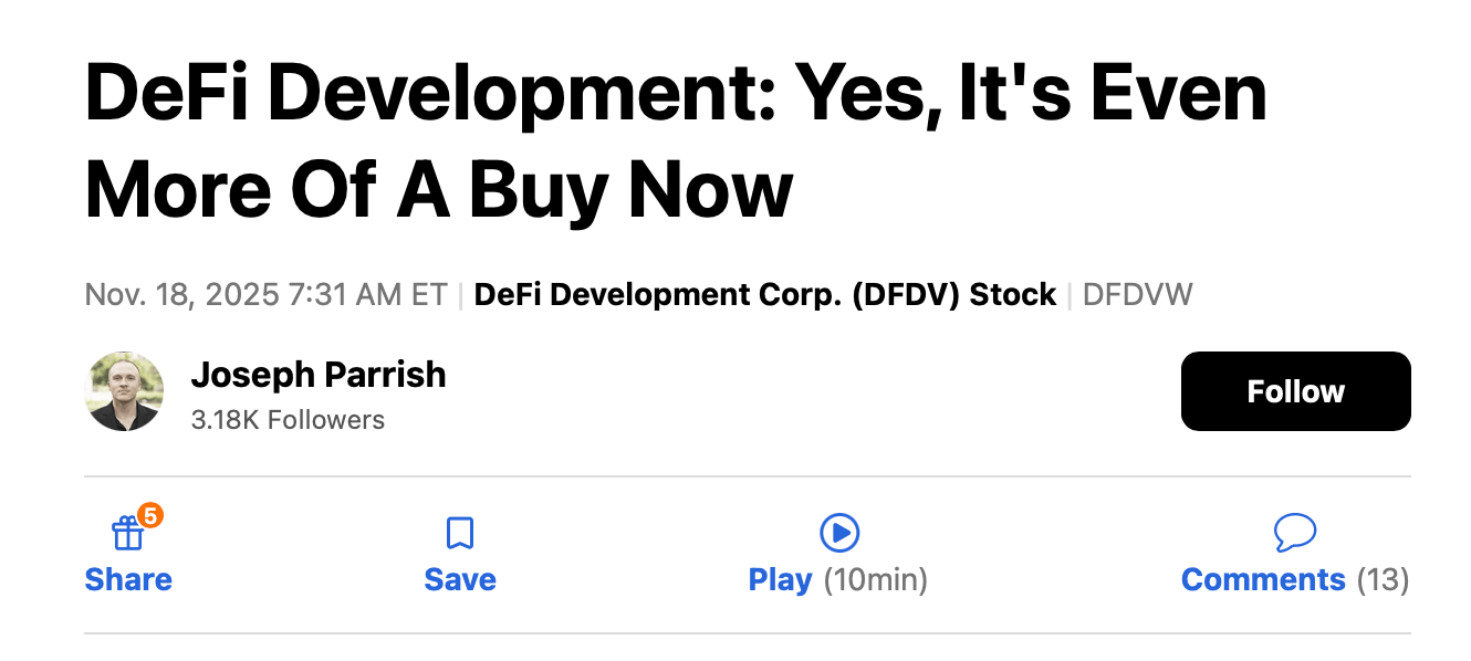 On November 18, Seeking Alpha analyst Joseph Parrish reiterated his “BUY” on DeFi Development Corp. with his latest report, “DeFi Development: Yes, It’s Even More Of A Buy Now.”