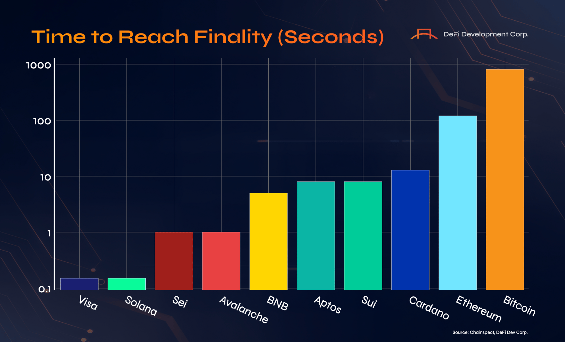 Another key differentiator is transaction finality: the time required for a transaction to be permanently added to the blockchain and become irreversible. As shown in Figure 5, Solana’s finality is roughly 0.15 seconds, putting it on par with centralized Web2 payment systems like Visa.